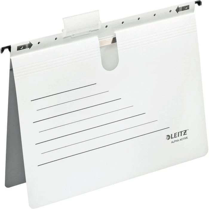 sonstiges: zur Ablage von gelochtem Schriftgut, schwarzer Organisationsdruck, störungsfreier Transport dank einschiebbaren Hängehaken und Vollsichtreiter, mit Falzungen für eine individuelle Einstellung auf die Inhaltsmenge